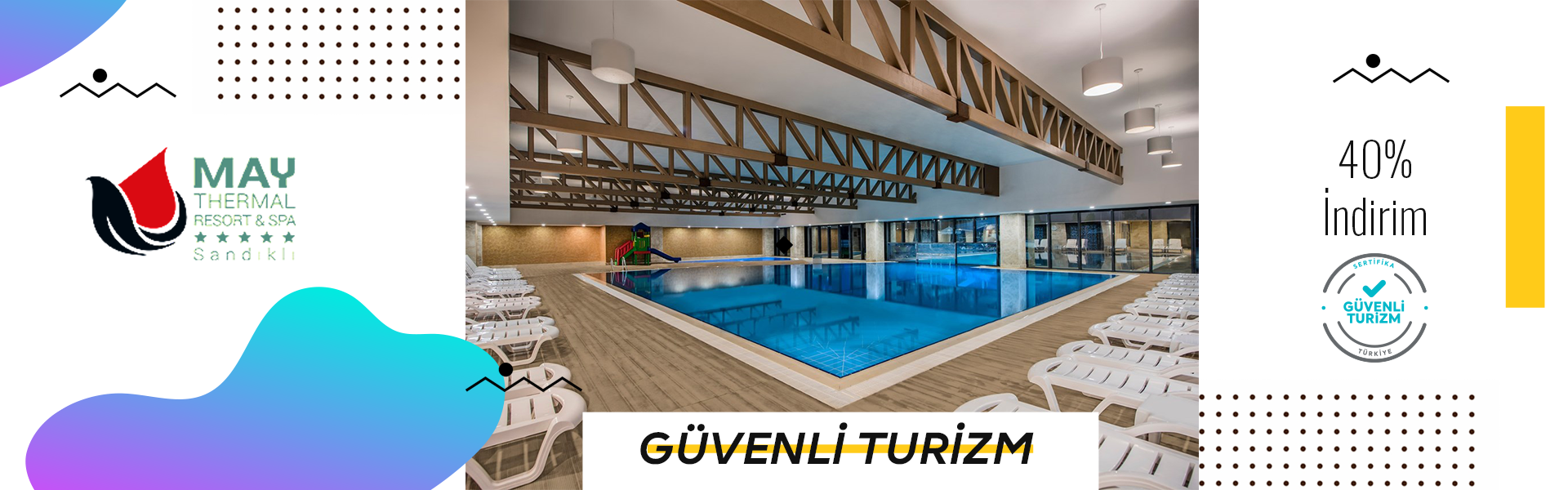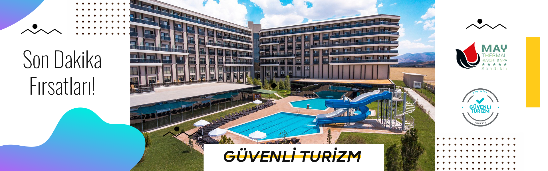 Sandıklı’daki tesis May Thermal Resort & Spa, bölgenin önemli termal kaynaklarından Hüdai Kaplıcaları’nın suyunun yenileyici etkisini konforlu bir tatil ile buluşturuyor. Lüks odaları, restoranı ve çocuklara özel olanakların il tesis, her yaştan misafire hitap ediyor.